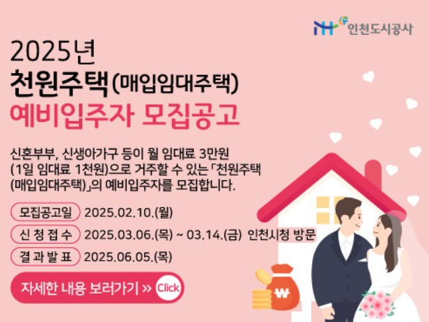 신혼부부 및 신생아 가정을 위한 인천 천원주택(매입임대주택) 예비입주자 모집이 시작됩니다! 월 3만 원의 부담 없는 임대료로 안정적인 주거를 확보하세요. 신청은 오프라인 방문 접수로 진행되며, 사전 서류 준비가 필수입니다. 모집공고를 확인하고 신청 기회를 놓치지 마세요!
